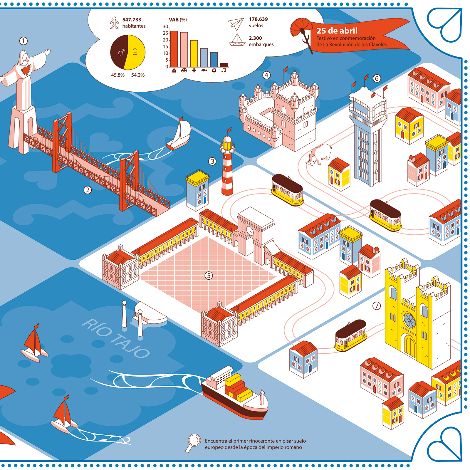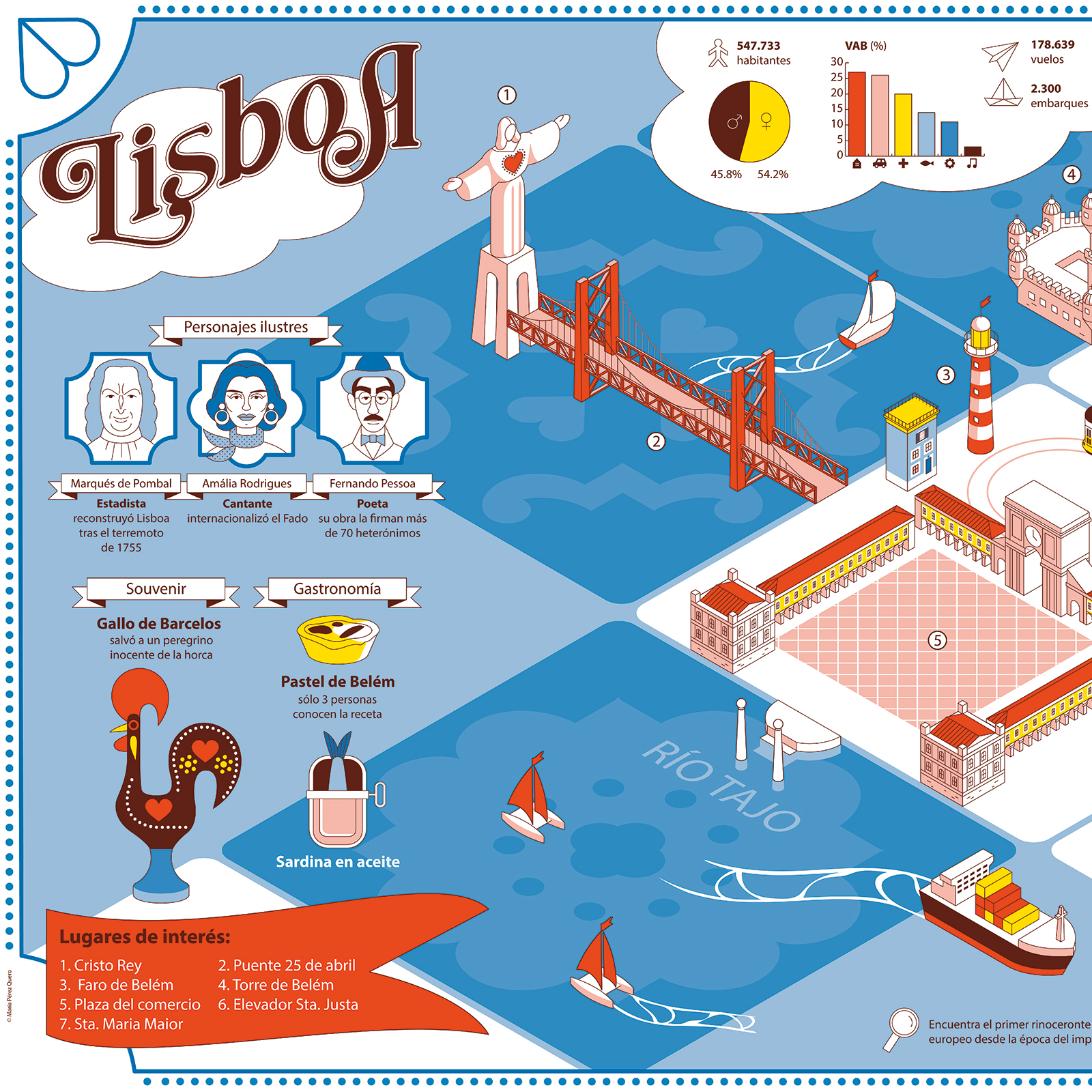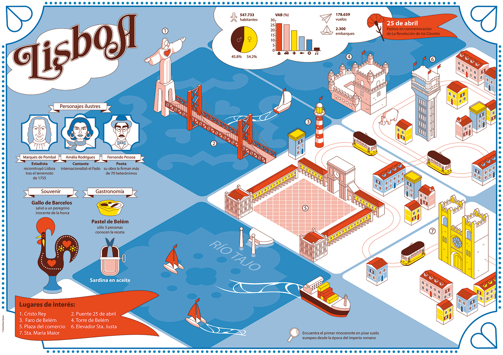 Isometric infographic of Lisbon featuring its most iconic landmarks, cultural symbols, notable historical figures, and key facts, presented through a detailed and visually engaging composition.